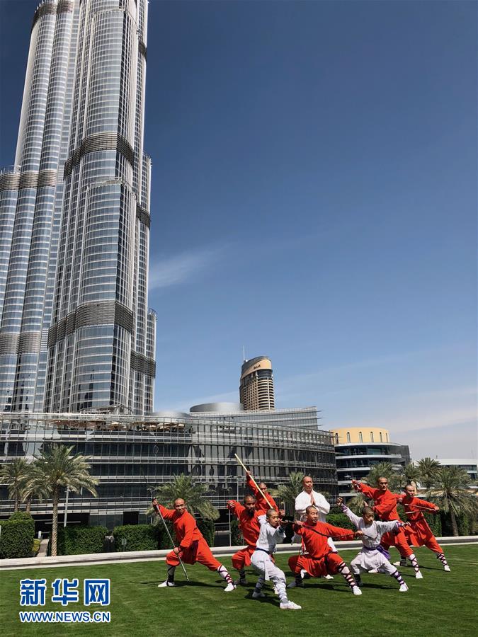 2月26日,在阿聯酋迪拜,《武林時空》演員在世界第一高樓哈利法塔前亮相。大型綜藝舞臺劇《武林時空》27日在阿聯酋迪拜歌劇院舉行首場演出。《武林時空》由中國對外文化集團公司出品,自2000年首演以來足跡遍布世界近300座城市,成為國際演出市場經久不衰的“中國制造”品牌。新華社記者蘇小坡攝