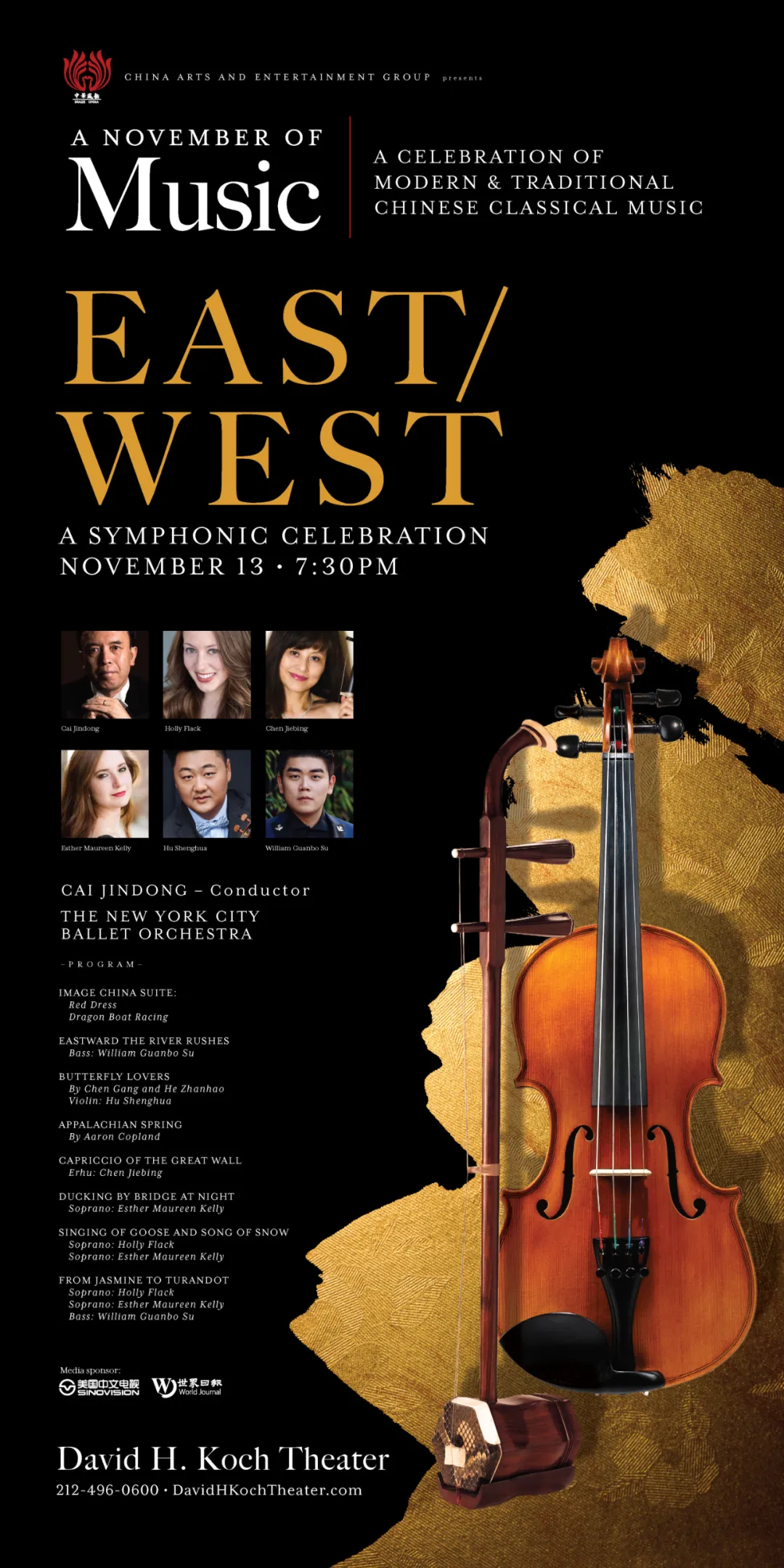 “中華風(fēng)韻”作為中國(guó)對(duì)外文化集團(tuán)有限公司打造的高端對(duì)外文化交流品牌,由所屬中國(guó)對(duì)外演出有限公司負(fù)責(zé)具體實(shí)施,此次為該品牌在疫情之后的首次線下亮相。當(dāng)晚的音樂(lè)會(huì)由著名華人指揮家蔡金冬執(zhí)棒,特邀小提琴家胡盛華、二胡演奏家陳潔冰、男低音蘇冠搏、女高音霍莉·弗萊克和埃絲特·莫琳·凱莉與紐約城市芭蕾舞團(tuán)交響樂(lè)團(tuán)合作演出,共同帶來(lái)小提琴協(xié)奏曲《梁?!?、二胡協(xié)奏曲《長(zhǎng)城隨想》、歌曲《從茉莉花到圖蘭朵》等名曲佳作,讓現(xiàn)場(chǎng)近2000名觀眾體驗(yàn)了東西方藝術(shù)融合的魅力。