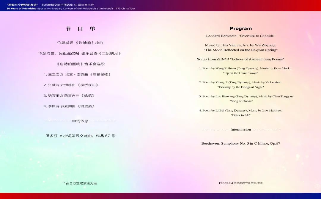 2023年,“跨越半個(gè)世紀(jì)的友誼”紀(jì)念費(fèi)城交響樂團(tuán)訪華50周年音樂會節(jié)目單。