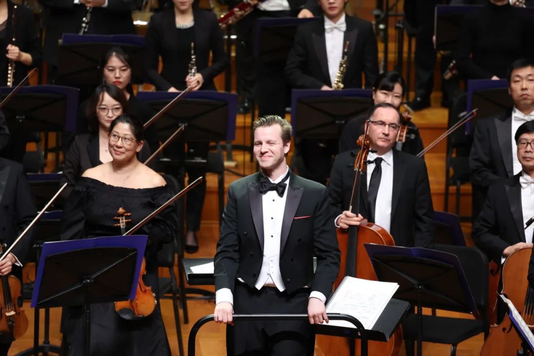 音樂會在現(xiàn)場全體觀眾不消歇的掌聲中,迎來了中、美兩國指揮家的兩度返場。先是特里斯坦·瑞斯·舍曼執(zhí)棒,安可了一曲中國近代音樂家劉天華的《良宵》,接著是李心草執(zhí)棒,安可了又一曲美國作曲家萊羅爾·安德森的《快樂的提琴手》。《良宵》原名《除夜小唱》,創(chuàng)作于1928年的除夕,表達(dá)了作者對美好未來的向往;《快樂的提琴手》則創(chuàng)作于1947年,演奏帶有炫技的意味,是美國各交響樂團(tuán)舉行的音樂會上作為返場的常備曲目。兩首安可曲畢,音樂會方才完滿結(jié)束。