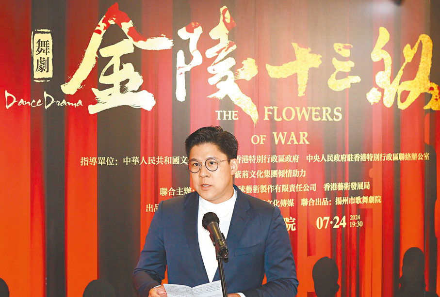 戰火紛飛擾秦淮,巾幗傲骨十三釵。為支持香港打造中華優秀文化傳播基地,積極推進中外文化藝術交流中心建設,「國風國韻飄香江」舞劇《金陵十三釵》于昨晚在香港文化中心大劇院隆重登場。香港藝術發展局主席霍啟剛致辭時表示,此次香港藝術發展局與中演公司合作,將《金陵十三釵》舞劇帶來香港,不僅加強了內地與香港文藝界的合作和聯系,也為香港觀眾帶來了在本港欣賞內地優秀藝術作品的難得機會。