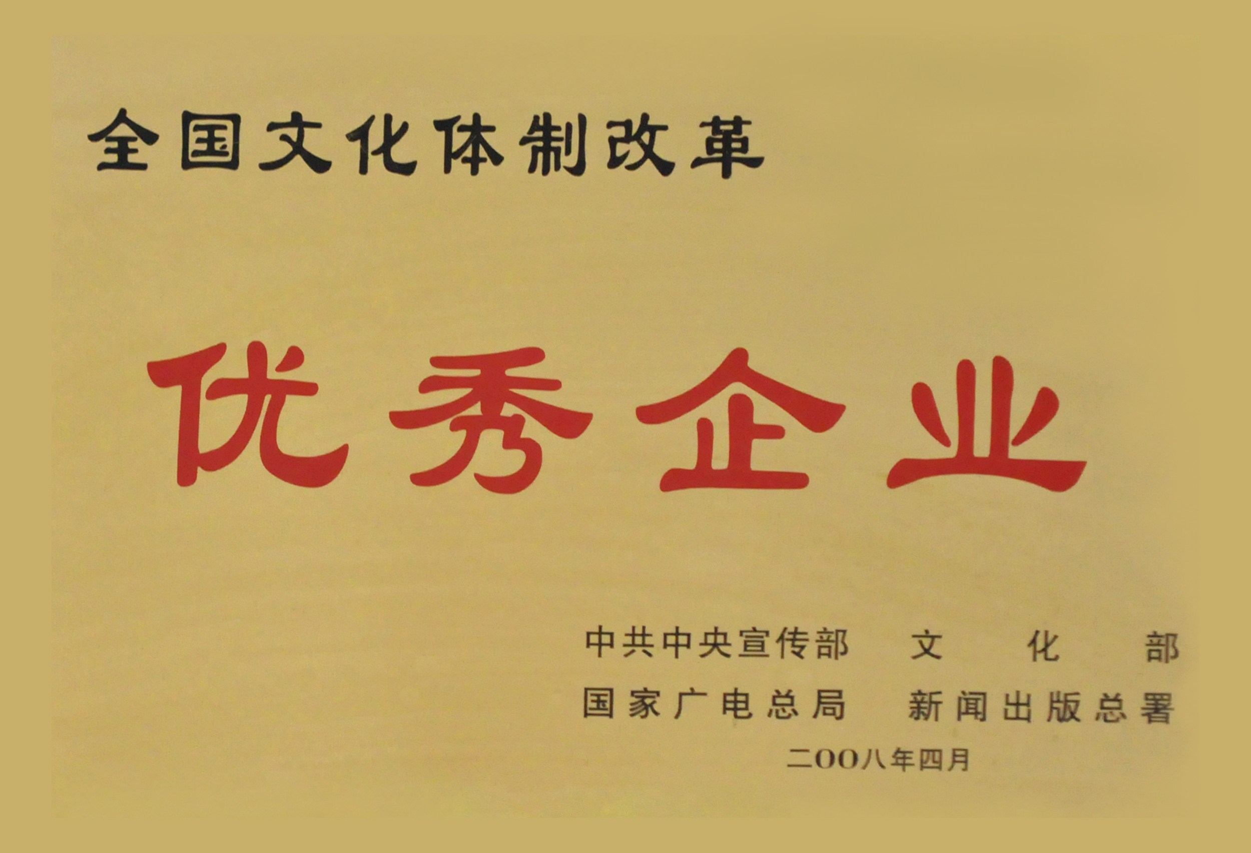 2008年4月,中共中央宣傳部、文化部、國(guó)家廣電總局、新聞出版總署授予“全國(guó)文化體制改革優(yōu)秀企業(yè)”稱號(hào)。